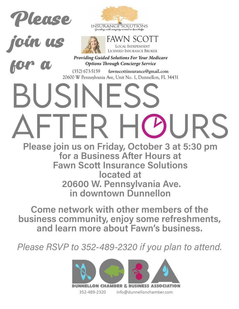 Please join us on Friday, October 3 at 5:30 pm for a Business After Hours at Fawn Scott Insurance Solutions located at 20600 W. Pennsylvania Ave. in Dunnellon.