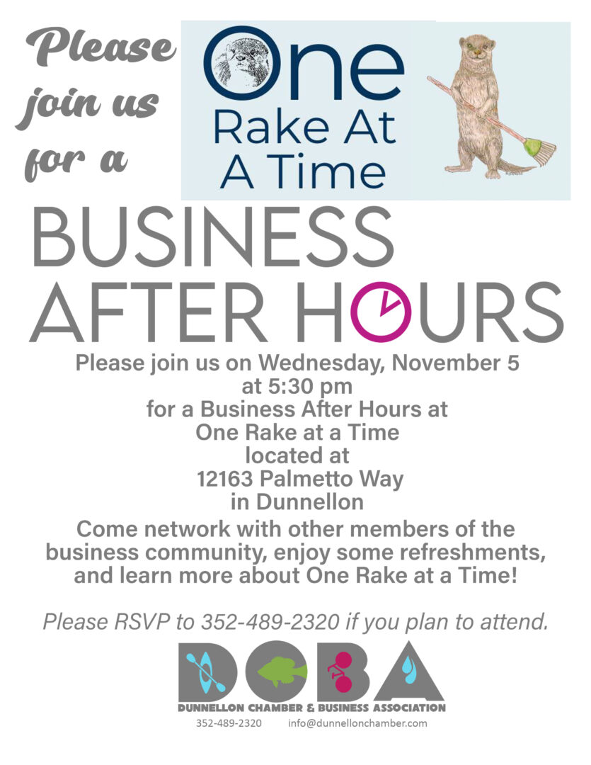 Please join us on Wednesday, November 5 at 5:30 pm for a Business After Hours at One Rake at a Time located at 12163 Palmetto Way […]