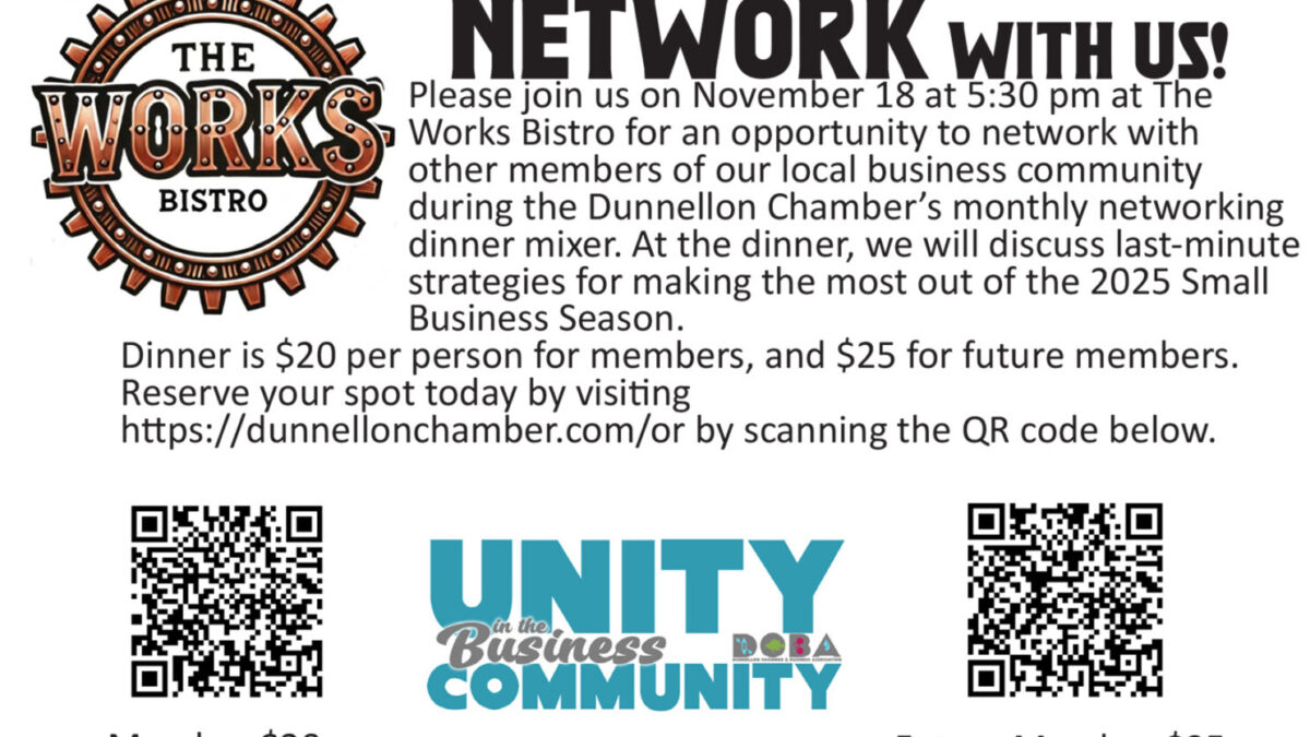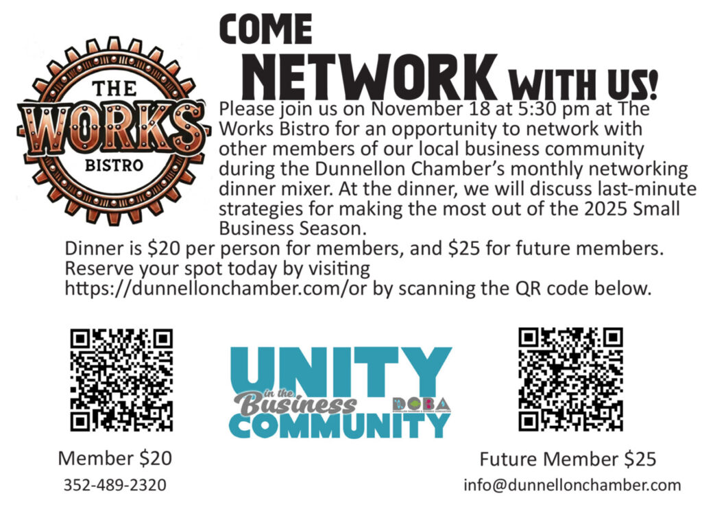 October 14, 2025Please join us on November 18 at 5:30 pm at The Works Bistro for an opportunity to network with other members of our local business community during the Dunnellon Chamber’s monthly networking dinner mixer. The Works Bistro is located at 12169 S. Williams St. in Dunnellon.
